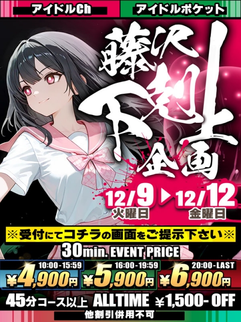 藤沢駅の南口から徒歩約1分の好立地!『アイドルCh』で心身ともに癒されてみませんか?日常ではなかなか出会えない可愛いアイドル級の女の子たちが、あなたを至福の時間へと誘います。さらにさらに!綺麗な店内とご奉仕大好きな女の子の極上のサービスに貴方の心は鷲掴みされること間違いなし!藤沢トップレベルのホットなお店だからこそ味わえる極上のひと時を、ぜひ同店で体感してください!さまざまなタイプの女の子が在籍しているお店なので、貴方だけのアイドルがきっと見つかりますよ。