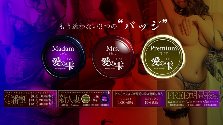 「愛のしずく」は東海地区で最大級の規模を誇る人妻専門デリヘルです。癒やし・優しさ・エロさを備えた人妻と、心ゆくまで濃密プレイを楽しめますよ!通常は有料であることが多い、即尺・アナル舐めといったオプションが無料な点も要注目♪今池で極上のエロタイムを過ごしたいなら欠かさずチェックしましょう!