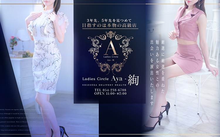 静岡県中・東部をエリアにしている完全会員制高級デリバリーヘルス【Aya-絢】。街を行き交う普通のOLさん・女子大学生・新妻など...。その中でもちょっと目を引く女の子。そんな女の子達を相手に様々な妄想を抱いたことはありませんか?私はあります!【Aya-絢】はそんな魅力ある女の子との出会いを演出してくれます!今までの私の言葉でビビッと来た方は要チェックです!!完全会員制高級デリヘルをぜひ味わってみてください。