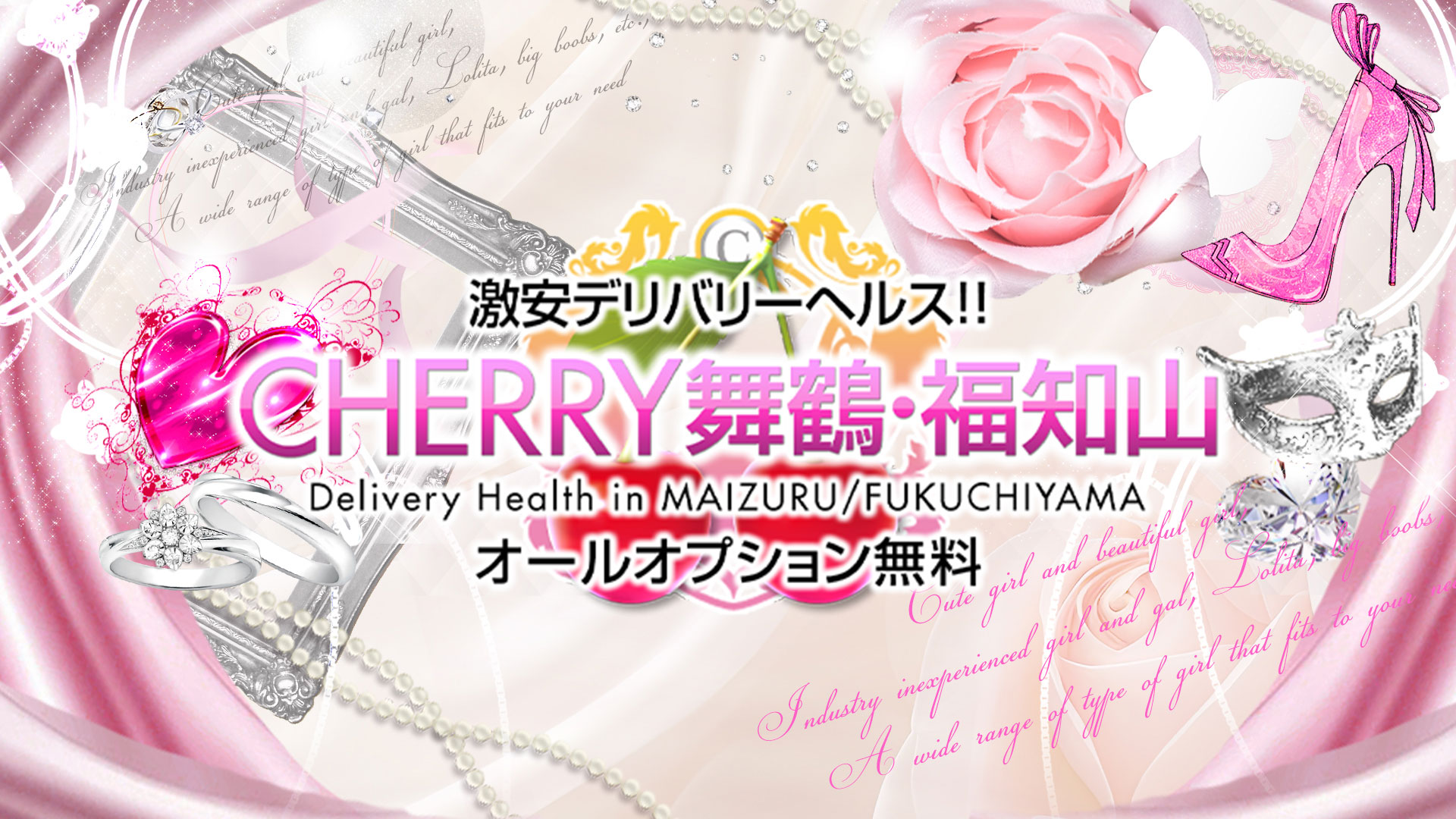 『チェリー舞鶴・福知山』はオールオプション無料が魅力な京都・舞鶴の激安デリヘル店!AF(アナルファック)のみ有料ですが、コスプレやとびっこ、聖水、即尺、ごっくんなど豊富なオプションを追加料金いらずで存分に楽しめますよ。西舞鶴・綾部・福知山・宮津エリアを中心に出張サービスを行っているので、気軽に過激プレイを楽しみたいのであればココを利用するほかありません!