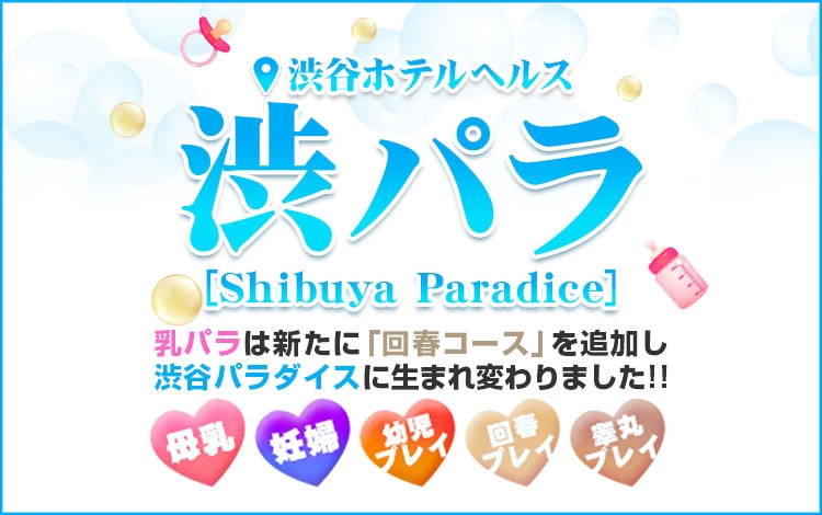 日本全国から注目の渋谷道玄坂ホテヘル「乳パラ」が、人気の母乳・妊婦・幼児プレイに加え「回春コース」を追加し【渋谷パラダイス】に生まれ変わりました!妊娠中や育児中、幼児プレイが得意で母乳全開のママさん達が多数在籍!さらに専門講師の講習を受けたキャストによる匠な回春プレイと睾丸プレイが楽しめるコースも新設!受付ではモザイクなしのお写真が無料でご覧いただけます!