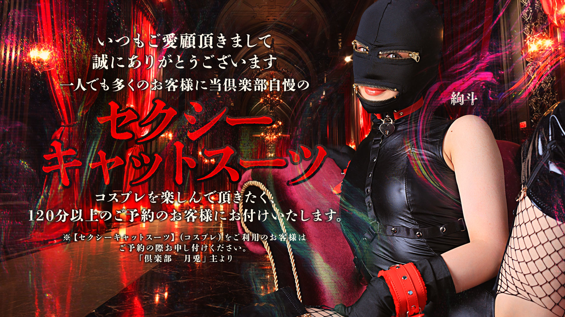 貴方の欲望、叶えます。そんなことを言えるのはもちろんサービスに自信があるから。ここ「倶楽部月兎【逆夜這い】」は貴方の持つ欲望を全て掬い取ってくれる最高のサービスがあります。高級店だからこそできるきめ細かい接客と心遣いは、一度味わえば病みつきになること間違いなし。在籍人数も50人越えとタイプも選びたい放題。貴方の「好き」がきっとある、きっと満足できるお店であります。淑女が乱れ狂い、欲望を貪る姿を焼きつけましょう。