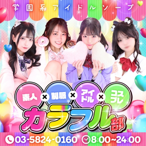 KKMグループの学園系ソープ【カラフル部】。業界初の圧倒的なカラーバリエーションを誇るオリジナル制服で、他店とは一線を画す今ドキなスタイル!在籍するのは実年齢20歳前半、厳しい基準で選ばれた美少女のみだそうです。連日の体験入店ラッシュも見逃せません。お手軽な料金でトップクラスの学園系ソープを楽しめるのも魅力なんだとか!可愛い制服×可愛い美少女で、あなたの青春のやり直しが今ここから始まります。