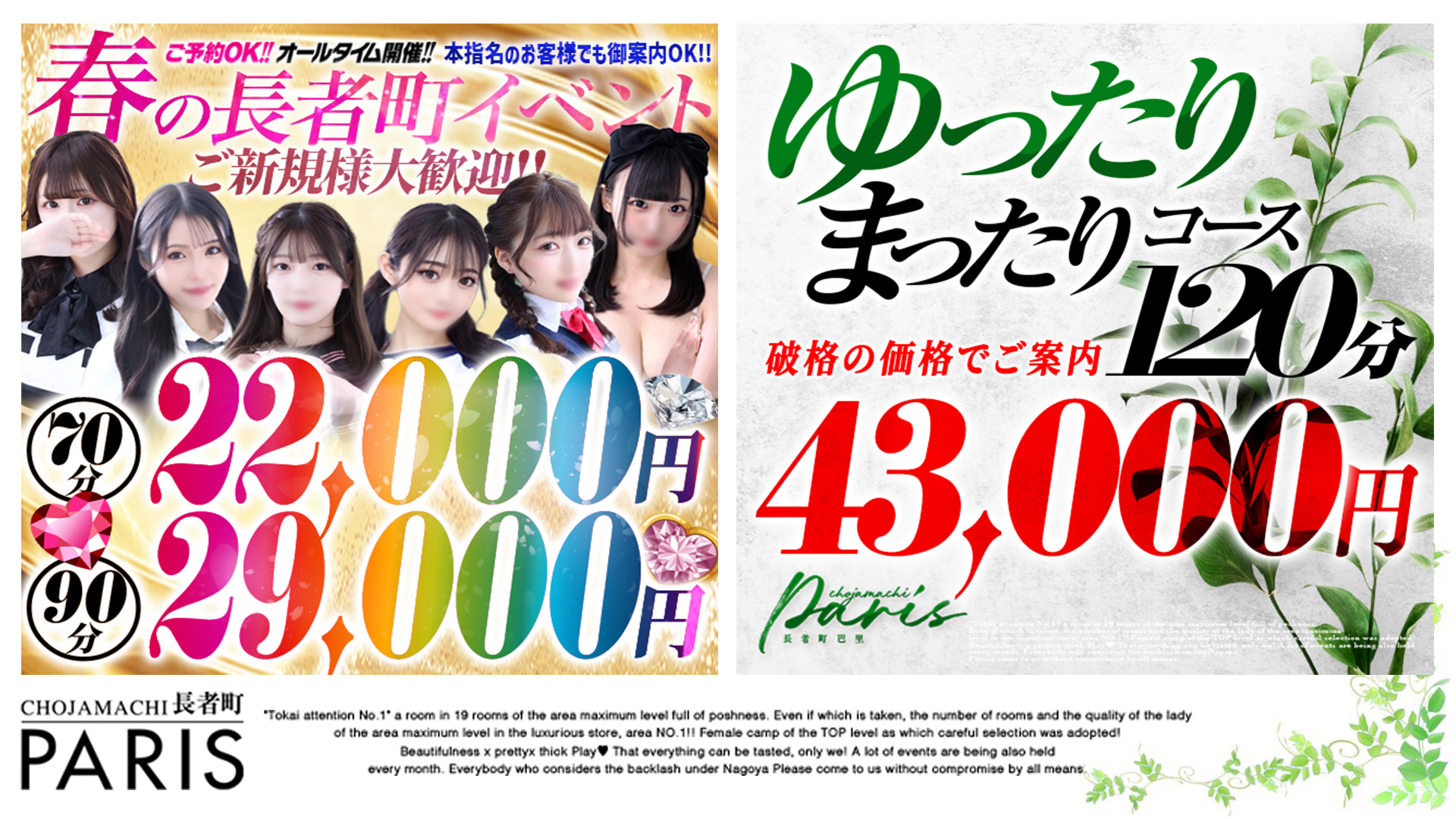 エリア最大級のお部屋数を誇る『パリ 長者町』。高級感あふれるオシャレな個室で、厳選されたトップレベルの女性と癒しの時間を過ごすことができます。コースによって楽しめるプレイが変わるほか、様々なオプションも用意されています。さらに頻繁にイベントも実施中。1つのお店なのに、遊びに行くたびに毎回異なる楽しみ方を味わうことができます。キレイ・かわいい・濃厚と三拍子そろったお店で、極上のひとときをお過ごしください。