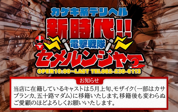貴方はまだ本当の「過激」を知らない。刺激を求めるすべての方へ『電撃戦隊セメルンジャー』を知らずして、「過激系デリヘル」を語るべからず。とことんリアルに拘る同店では、「まるでAVのような体験ができる」と広島では言わずと知れた人気店。オプション料金無料に加え、電マ・オナニー動画見放題等、まさに今までになかった”革新的”デリバリーヘルスです。普段の風俗遊びにマンネリを覚えているそこの貴方。『電撃戦隊セメルンジャー』で新しい自分を発見してみてはいかがですか?