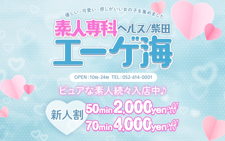 可愛くて愛嬌もあって、とっても優しい!そんな女の子と遊びたいならここ『エーゲ海 SHIBATA』。お任せイントロコース40分9,000円~という遊びやすい値段で楽しむことができます。店舗は名鉄線常滑線柴田駅改札を出てすぐの所にあります。一生懸命ご奉仕してくれる女の子たちの姿勢に、トロトロに溶かされて心まで奪われてしまうでしょう。上質な経験をぜひ、お試しあれ。