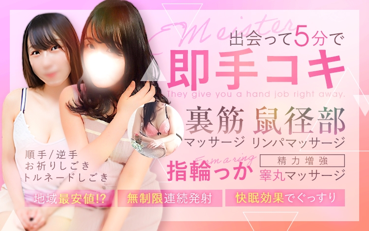 風俗で焦らされるより、すぐに【昇天】したい殿方必見のお店!「イーマイスター」は、すぐに気持ちよくなってもらうことをコンセプトにお部屋に入ってから5分以内に気持ちよくなってもらう【即手コキ】システムを導入していますので女の子と存分に楽しめちゃいます★40分コースのリーズナブルな価格から楽しめることも嬉しいですよね♪初めての方にも常連さんにも地元で愛されるお店です☆基本サービスの内容がとても気になるお店なので、要チェック!