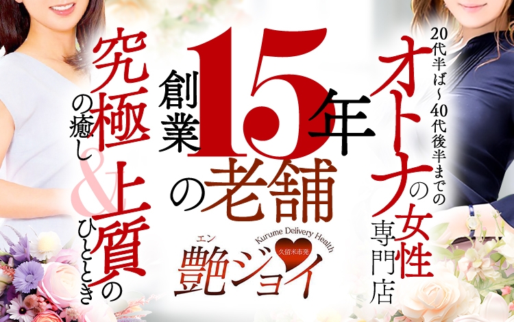 ぴゅあらば上の「艶ジョイ」のレビュー点数・レビュー件数はこちら当店は、25歳~50歳位まで幅広く、しかも厳選した良識ある女性ばかりが在籍する久留米発のデリヘル店です。容姿は勿論、スタイル、接客他、お客様に必ず満足して頂ける女性達ばかりです。是非、当店のコンパニオンと普段では味わえない【安らぎ】と【夢】の時間を・・・
