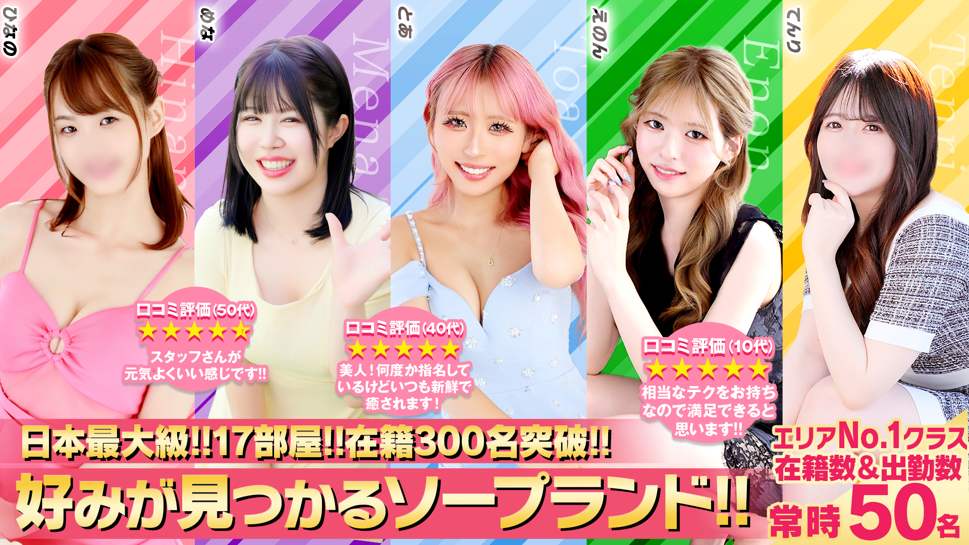 在籍人数200名以上!あなた好みの女の子が絶対見つかる五反田唯一のソープランド!部屋数は都内最大級の17部屋!五反田駅より徒歩1分♪早朝6時30~年中無休で営業中!お得な『局割』ご利用ください!
