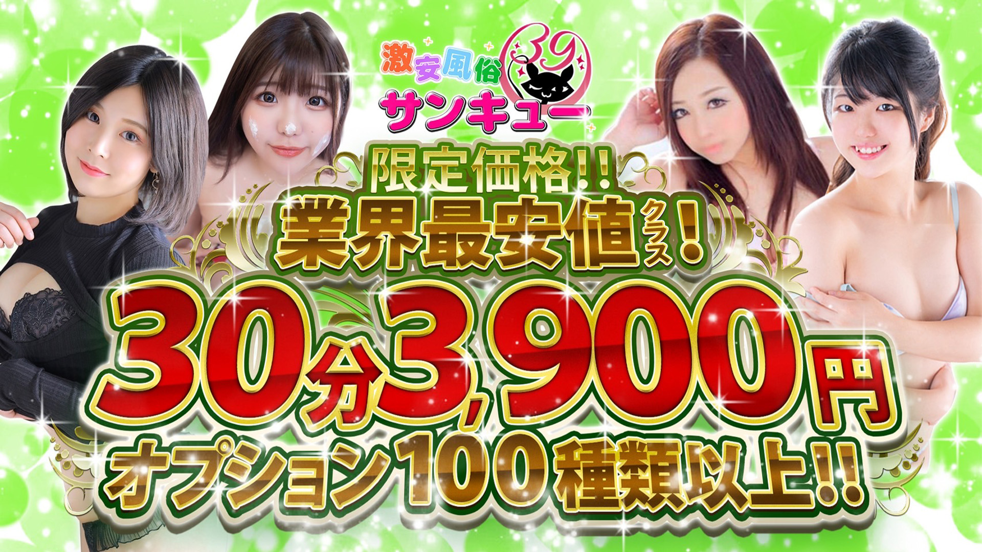 全国展開中の大手「サンキューグループ」が広島に上陸!なんと3900円からと全国的に見てもトップクラスの激安料金で遊ぶ事が出来ちゃいます!しかも昼も夜も同一料金なのが驚きですよね!しかも100種類以上の豊富なオプションがすべて【無料】で利用できちゃうんです...!こんな至れり尽くせりなお店もなかなかないのでは!?イベントも開催中なのでこちらも見逃せません!