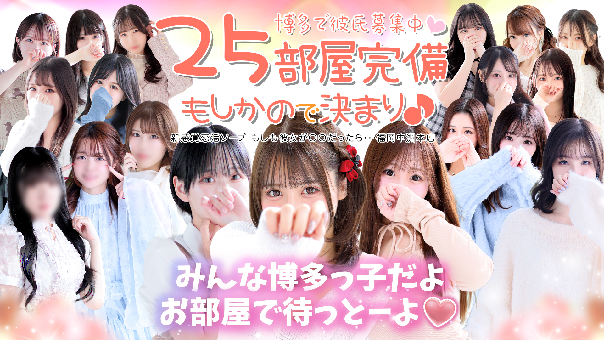 『新感覚恋活ソープもしも彼女が○○だったら…福岡中洲本店』は女の子と本物の恋人同士のようなイチャイチャな雰囲気を楽しめちゃうお店。どこか他人行儀で事務的なサービスに傷ついた経験がある。そんな方も、満足できること間違いなし!あなたの秘めた願望や妄想を形にしませんか?真心のこもったサービスで、幸せな気持ちを感じちゃいましょう。清楚感や素人感があふれるリアルな女の子が多数在籍しています。また、あなたの希望の彼女と過ごせるよう、「もしカノシート」という希望を書けるシートを導入している点もポイントです!