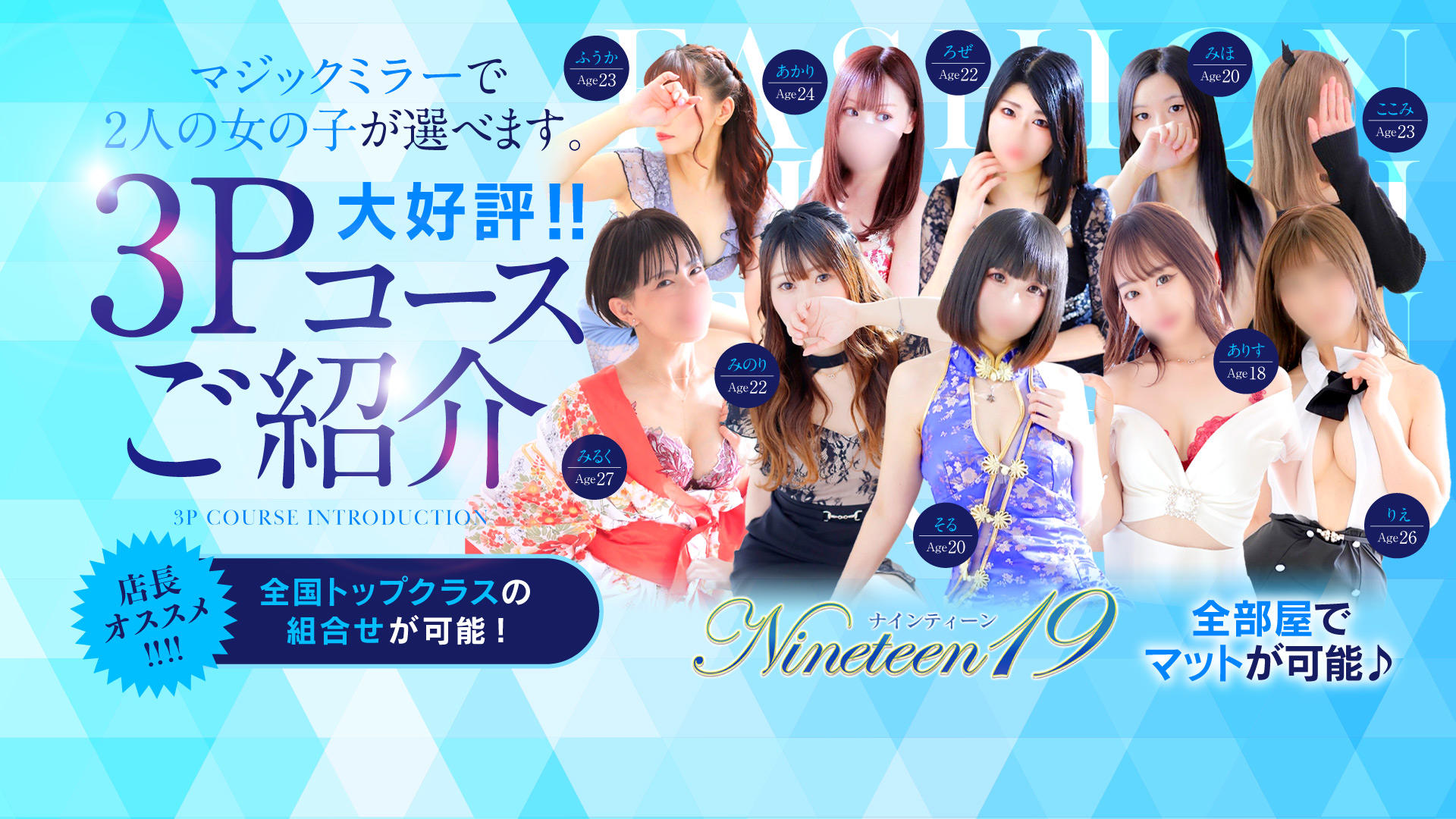 愛知県刈谷でフレッシュな女の子と遊びたいなら『ナインティーン』がピッタリ!こちらのお店にはフレッシュで愛嬌たっぷり、そしてサービス精神旺盛な女の子たちがいっぱいいるんです◎ついこの間まで学び舎に居たあどけない表情の女の子。タイトなOLコスチュームが似合いすぎのスレンダー美人。ちょっぴりSっ気あるお姉さまや爆乳自慢の美女。みんなが誠心誠意の優しい笑顔でおもてなし。性欲を抑えるなんてとんでもない。刈谷駅から近くの場所で、エッチな妄想を叶えてみませんか?
