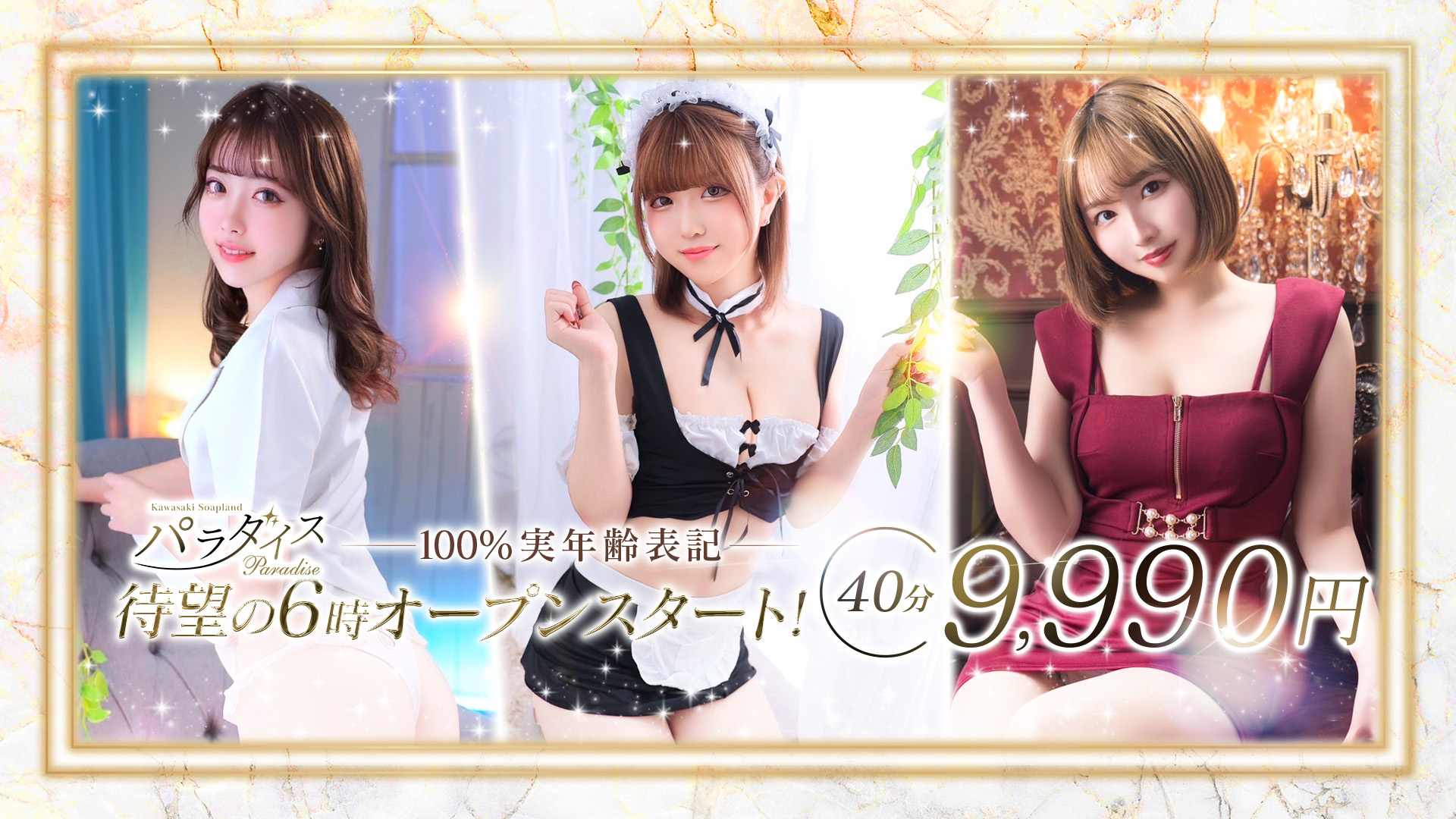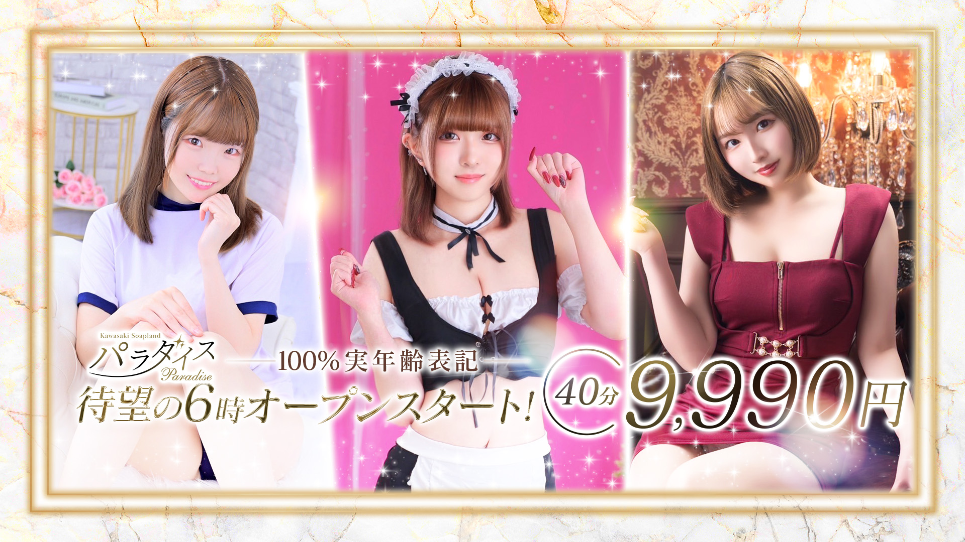 川崎にある『パラダイス』は、女の子のレベルに自信アリ!在籍しているのは、20代くらいまでの可愛い女の子たち。実年齢表記にこだわっているため、「出会ってみたらイメージと違った…」なんてガッカリも感じさせません!40分から利用できるので、サクッと遊びたい方にもピッタリですよ◎追加料金なしで選べるコスプレは、制服や体操服、チャイナ服やバニーガールなどいろいろあるから、自分好みの恰好でお出迎えしてもらうのも良いですね♪