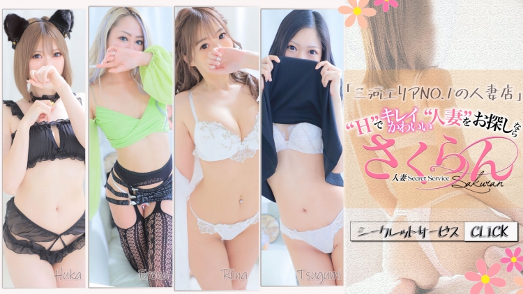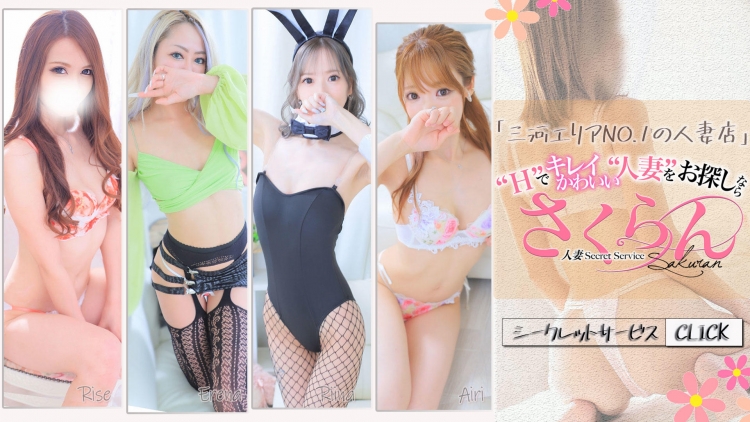 三河エリアの美人奥様が大集合したと言っても過言では無いトップクラスの人妻デリヘル店『さくらん 人妻Secret Service』。20代〜40代のS級若妻からベテラン熟女まで多数在籍。そんな高クオリティな奥様と基本コース60分15,000円〜というお値打ち価格で遊べちゃいます!また、メール会員になると1,000円OFFになります。さらに自動的に貯まるポイントを合わせて使えば、大幅な割引が可能です!