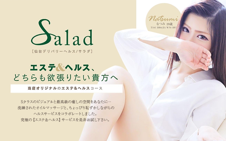 「salad(サラダ)」がおくる、極上の癒しをアナタへ。容姿・スタイルはもちろんのこと、接客スキルにもこだわっているのが同店。厳しい採用条件をクリアしたエステティシャン達は、どのコを選んでも大当たりの極上美女が目白押しです!キレイな女の子達に癒されてみるのも良し、ちょっとエッチな時間を満喫するも良し。その日の気分に合わせて女の子との過ごし方を変えることもできますよ!ぜひお好みの子と一緒にすごして、身も心もスッキリさせてみてください。