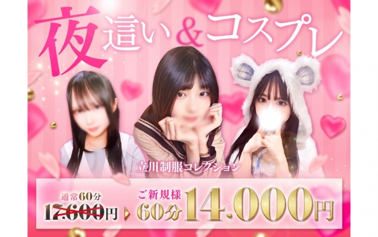 業界未経験の女の子が集まる、素人好きにはたまらない【立川制服コレクション】は立川駅から徒歩5分ほどの場所にある。業界に染まっていない女の子に夜這いする背徳感と緊張感。貴方のドロリとした人に言えないような欲望はこのお店でこそ叶えることが出来る。制服コレクションの名の通り、選べる衣装は50着近く。気になるあの娘に好きな衣装を選んで手を出しちゃいましょう。テクニックよりも素人の女の子と遊びたいあなたに。