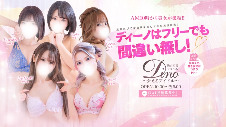 ディーノは仙台最大級の女の子の数を誇っているデリヘル店です。女の子の質とサービスには徹底しており、お客様に満足いただけるように運営しております。ディーノではお客様の要望に答えるべく日々女の子の発掘、サービスの教育を徹底しております。