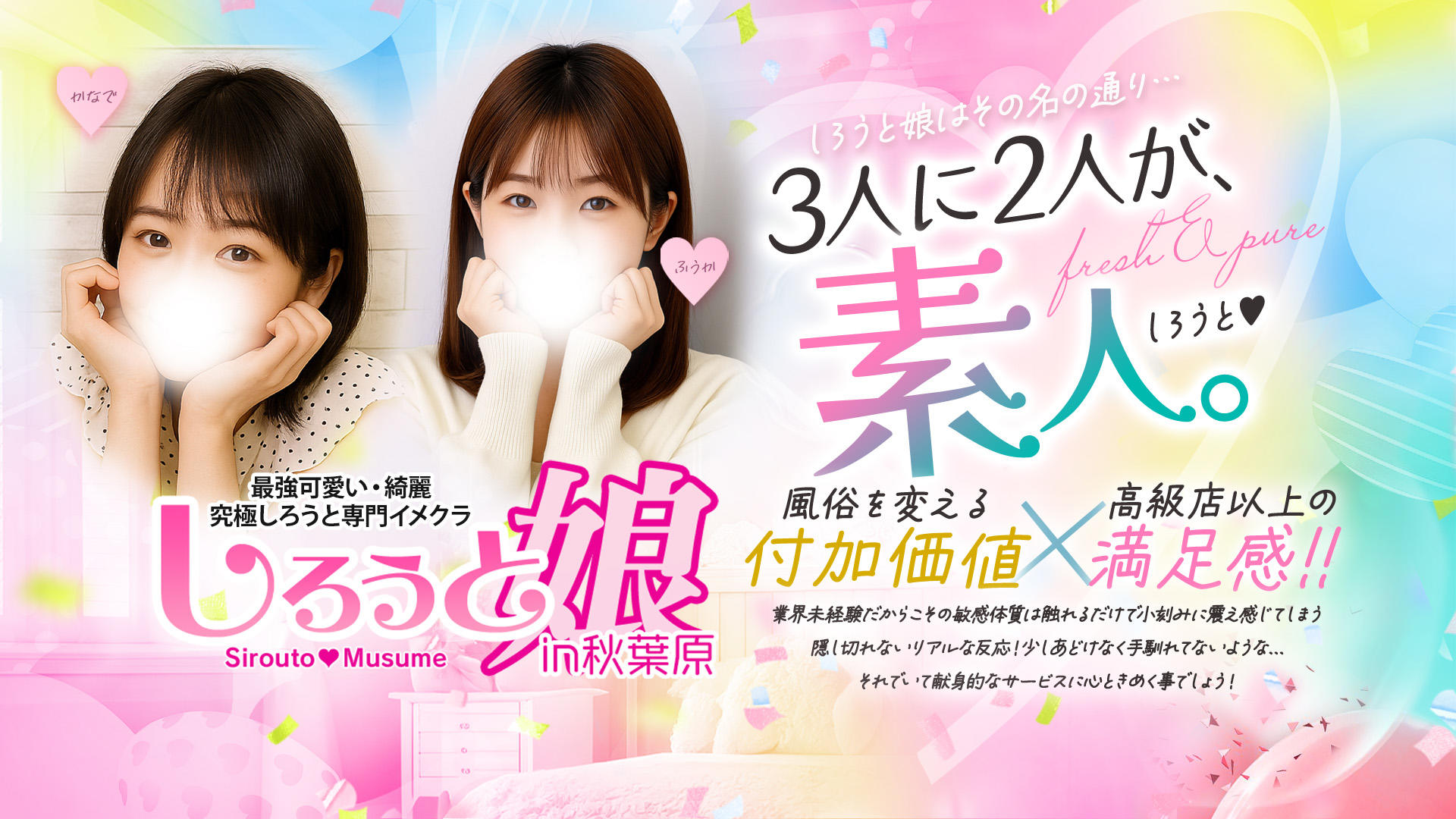 レベルの高い素人女子がたくさん在籍している『しろうと娘in秋葉原』。非常に厳しい基準で採用をクリアした女の子だけを集めている、キャストのレベルがとても高いお店です!また素人専門店なので、初々しい素人感を存分に楽しめるのもポイント。キャストがハイレベルで料金がリーズナブルということは、高級店のようなクオリティをコスパ良く堪能できるということです!最高の素人女子と遊びたい方はぜひ利用してみてはいかがでしょうか?きっと満足な時間が過ごせるでしょう。