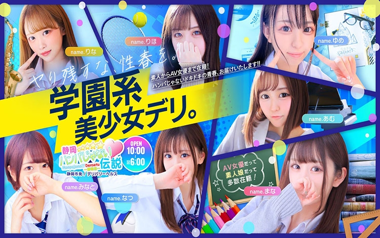山を越え谷を超え人気のフードルや女優さんがあなたの街にやってきた!「AV女優&人気フードルがやってくる店 ハンパじゃない伝説~静岡校」は、在籍している女性がハンパじゃなくカワイイ!すべてにおいてハンパじゃない楽しさがそこにある!ついこの間まで現役だった女の子ばかりです。制服の着こなしも違和感なく完璧!気分はさながらモテモテ男子生徒!お好みのシチュエーションで一度は夢見たあのプレイを楽しむことができるのでおすすめです!