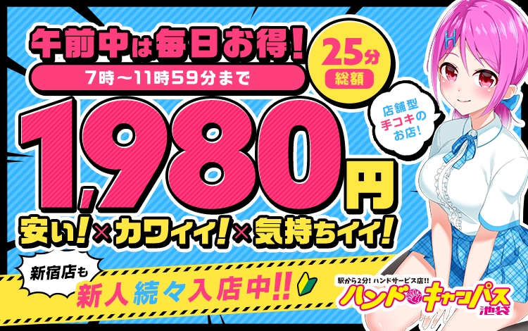 最安2,980円でサクッと遊べる手軽さと、若くて可愛い女の子たちからのサービスというハイコスパ!【ハンドキャンパス池袋】は池袋駅徒歩2分で、お手軽な値段と時間で遊べるお店です。20代前半の若くて業界経験がほぼ無い、でも可愛くてすれてない魅力的な女の子ばかりで、フリーで入った方が可愛くて癒されすぎたから延長しちゃったそうです!ご新規さんは指名料割引とのこと!是非一度お試しを!