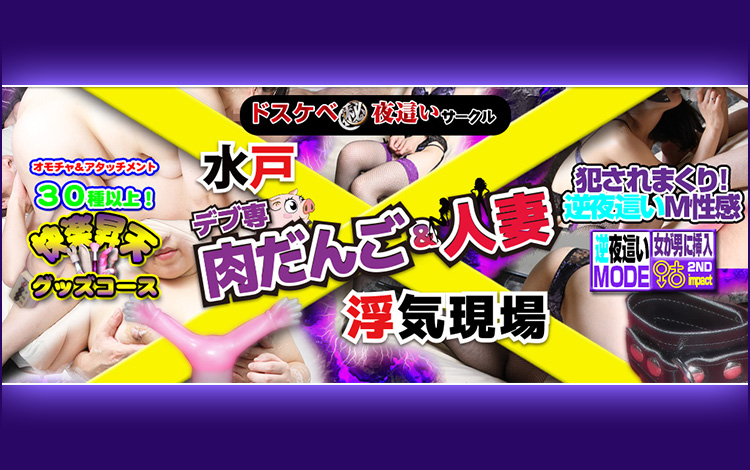 ドスケベ(秘)夜這いサークル!人妻さんと肉だんごちゃんが合体! 史上最強クラスの浮気現場が誕生しました! 快楽の絶頂への近道は、アナタ好みのプレイを選択してください☆【快楽グッズコース】【昇天夜這いコース】【逆夜這い「M性感」コース】★脳天の暗部を刺激する快楽が浮気現場にはあります★『水戸店舗型ヘルス』